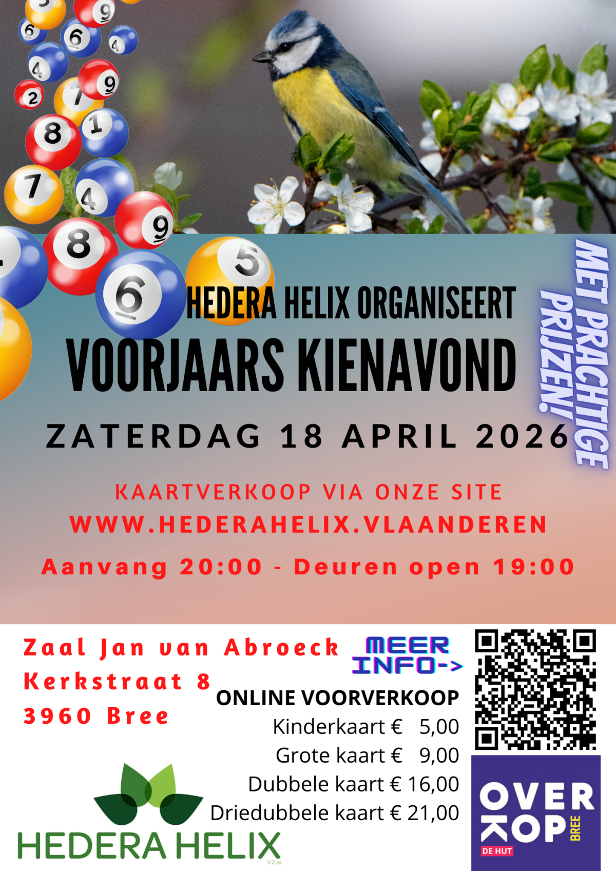 Wat leuk dat je er vorig jaar bij was โ het was gezellig, spannend รฉn vol mooie prijzen! Daarom nodigen we je met veel plezier opnieuw uit voor onze Voorjaars Kienavond.
